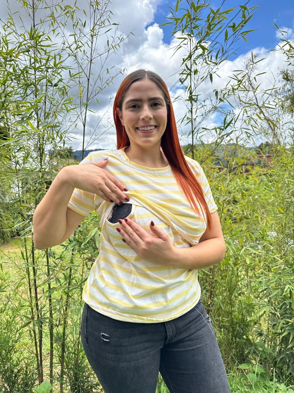 Blusa manga Corta, con funcionalidad para lactar, Estampado. Tela en algodón.