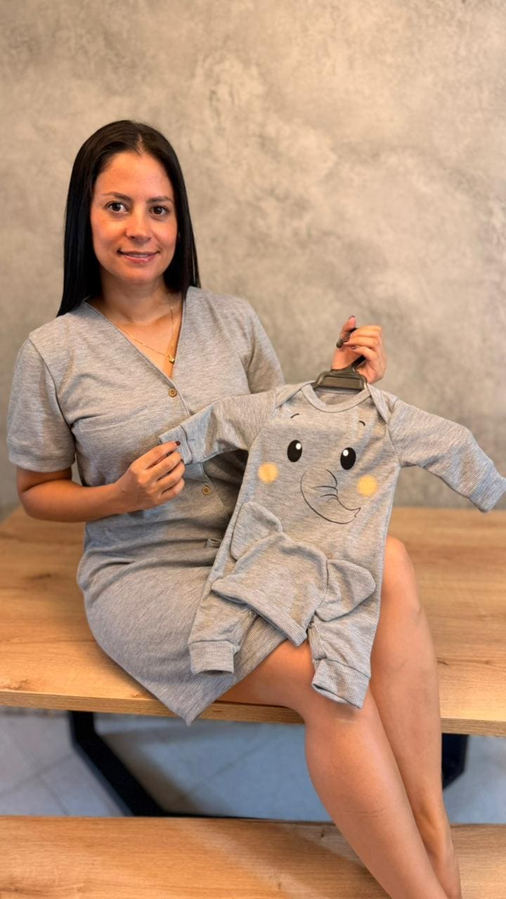 Dúo Batola con botones y manga corta. Enterizo talla única 0/3 meses. Mismo color para Mamá y Bebé. Tela con algodón.