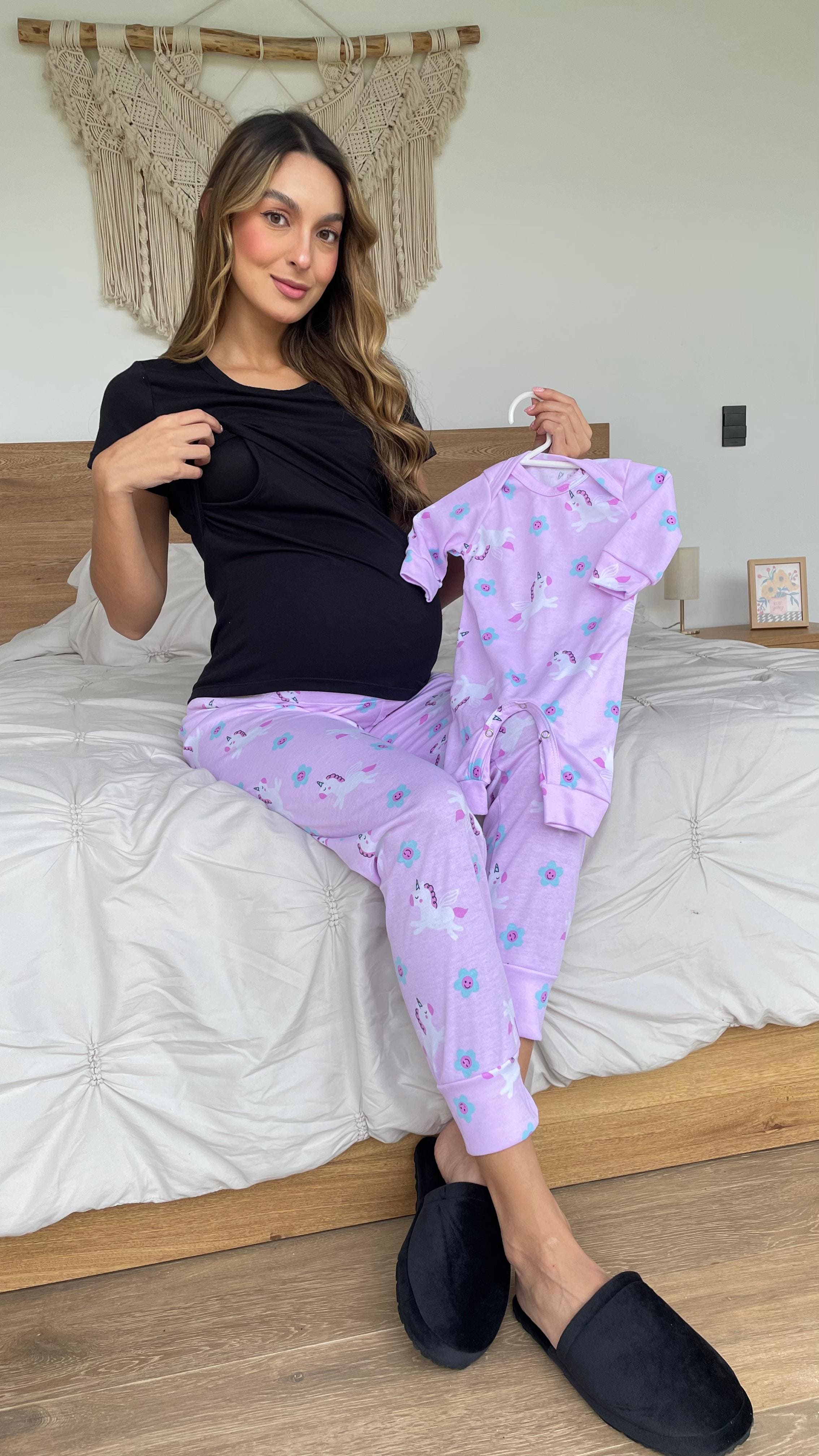 Dúo camiseta con funcionalidad para lactar. manga corta y Jogger con elástico en cintura. Enterizo talla única 0/3 meses. Tela con algodón.