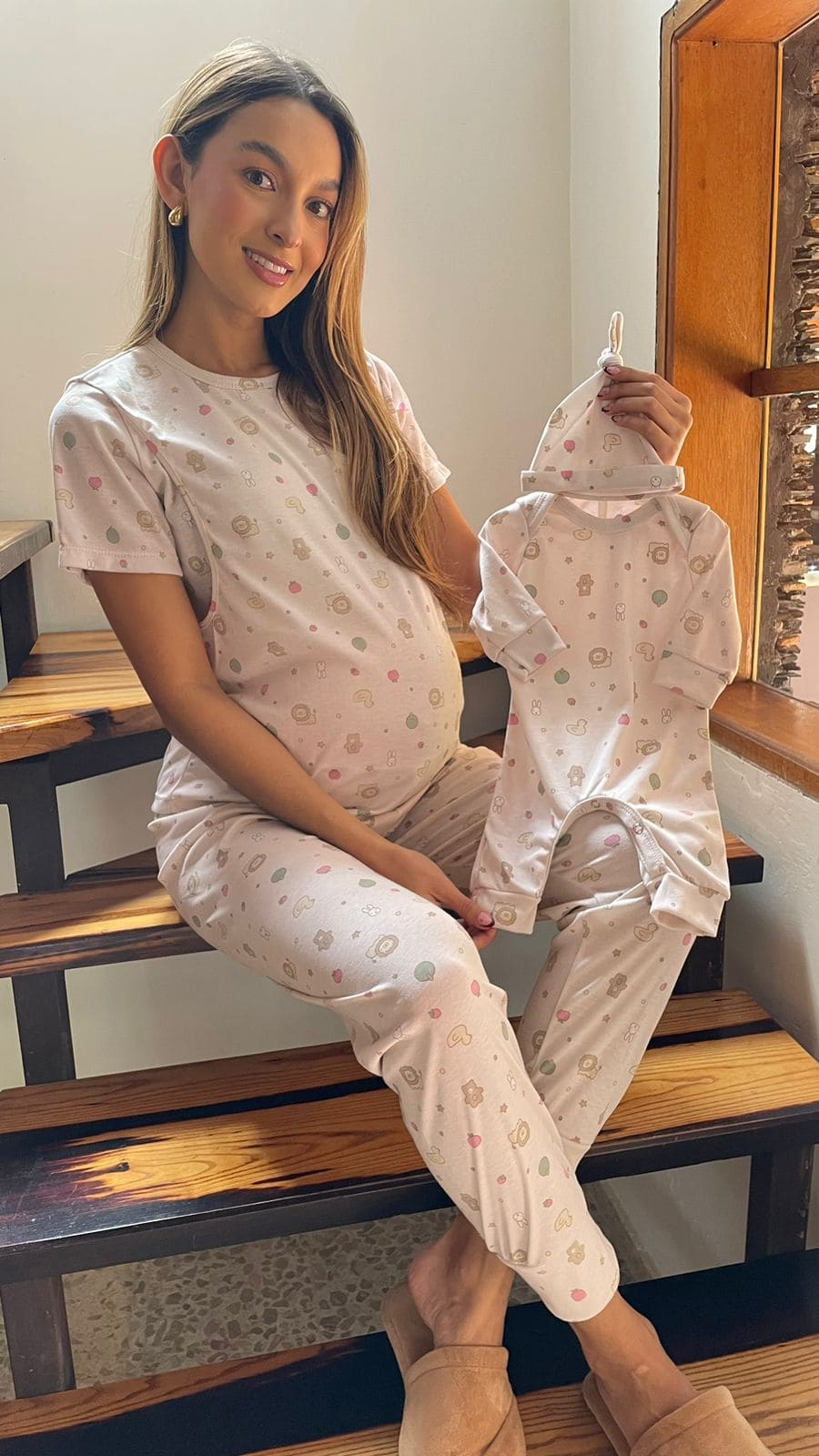 Dúo camiseta con funcionalidad para lactar manga corta y Jogger con elástico en cintura. Enterizo talla única 0/3 meses. Mismo estampado para los 2. Tela con algodón.