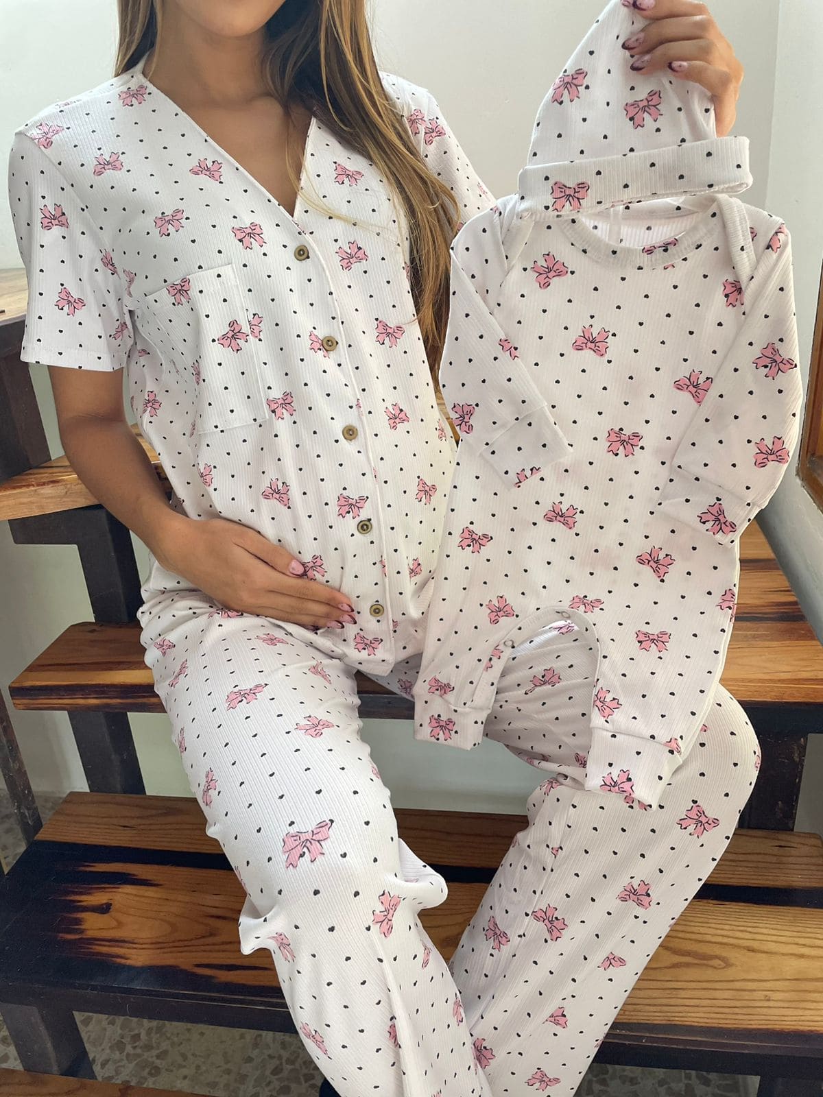 Dúo Camisa con botones y manga corta. Panatalón bota recta con elástico en cintura. Enterizo talla única 0/3 meses. Mismo estampado para los 2. Tela con algodón.